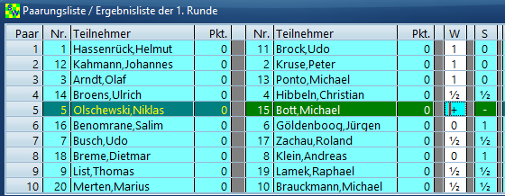 | Nr | Name,Vorname | DWZ | Verein | Er | ge | b | ni | s | s | e | Pkt. | |||